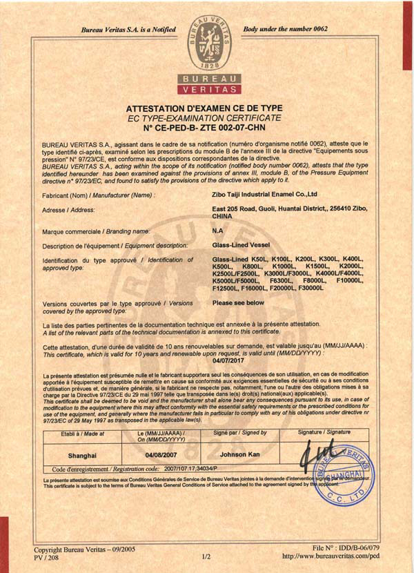 淄博太極在中國(guó)搪玻璃設(shè)備制造行業(yè)中首家通過(guò)ISO90001質(zhì)量體系認(rèn)證,并擁有美國(guó)ASME認(rèn)證、歐洲PED認(rèn)證以及國(guó)家部門頒發(fā)的搪玻璃制造許可證、進(jìn)出口許可證和百余項(xiàng)榮譽(yù)證以及三十六項(xiàng)專利等。